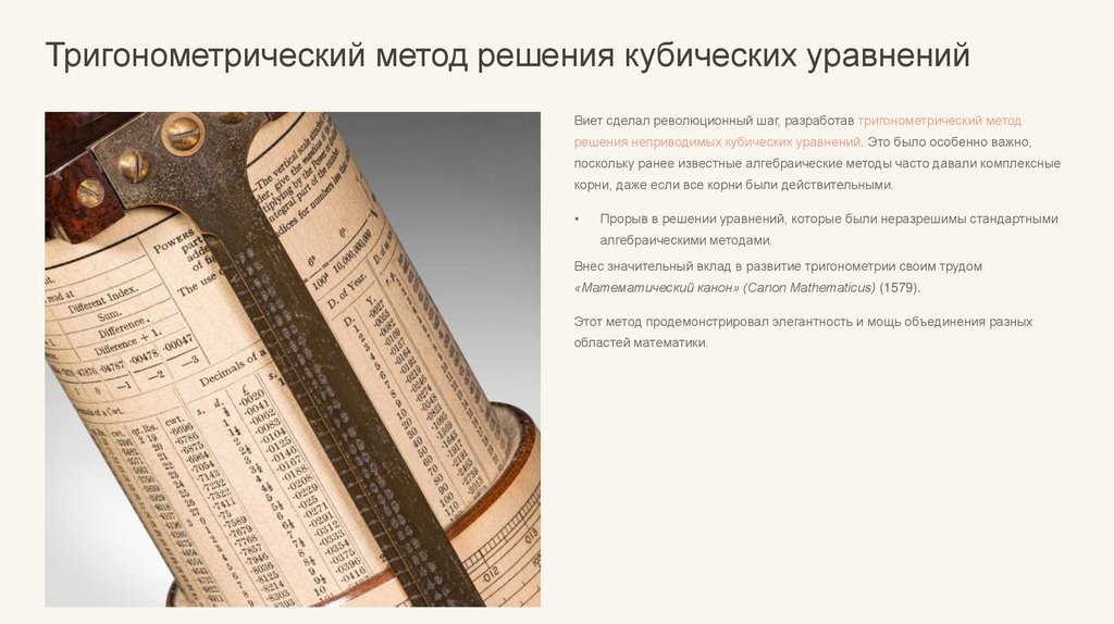 Тригонометрический метод решения кубических уравненийВиет сделал революционный шаг, разработав тригонометрический метод