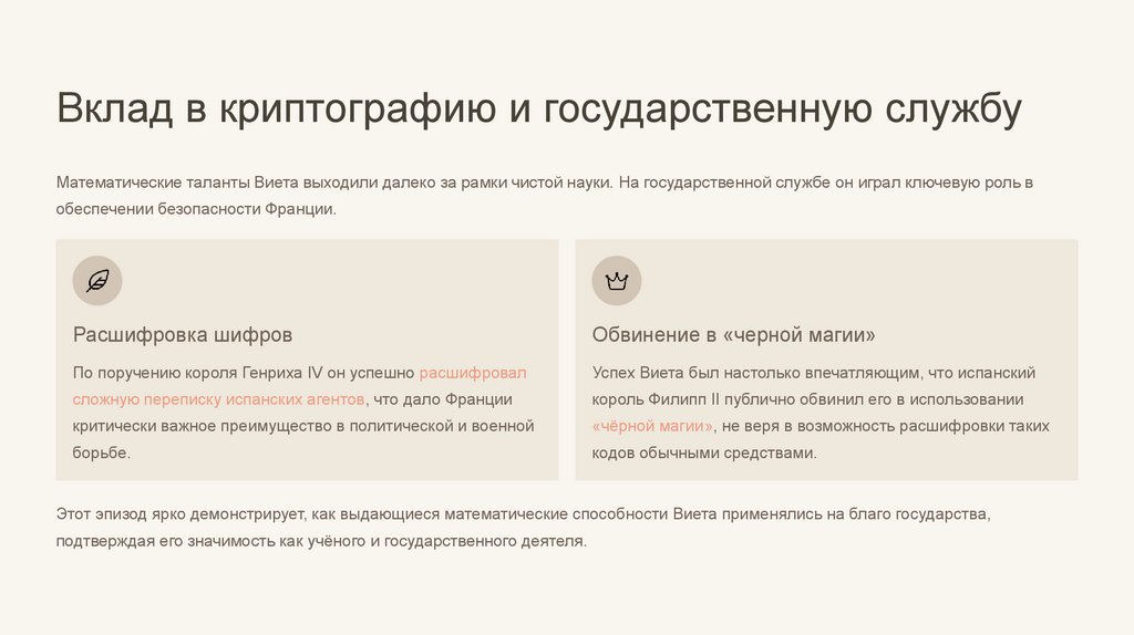 Вклад в криптографию и государственную службуМатематические таланты Виета выходили далеко за рамки чистой науки. На государственной службе он играл ключевую роль в