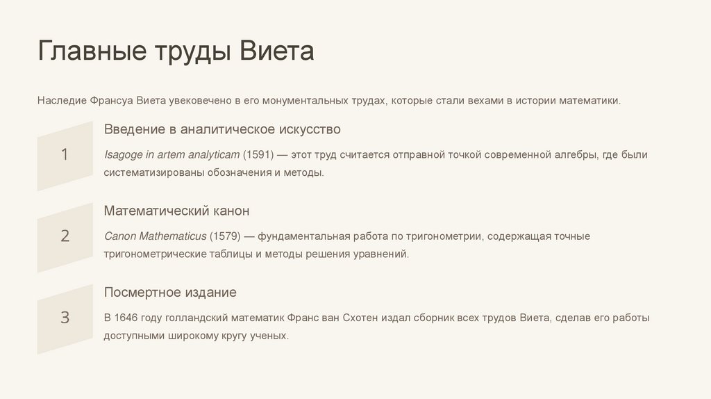Главные труды ВиетаНаследие Франсуа Виета увековечено в его монументальных трудах, которые стали вехами в истории математики.