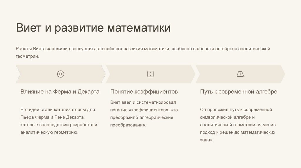 Виет и развитие математикиРаботы Виета заложили основу для дальнейшего развития математики, особенно в области алгебры и аналитической