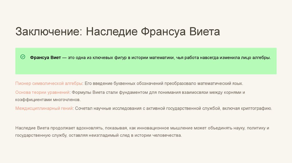 Заключение: Наследие Франсуа ВиетаФрансуа Виет — это одна из ключевых фигур в истории математики, чья работа навсегда изменила лицо алгебры.