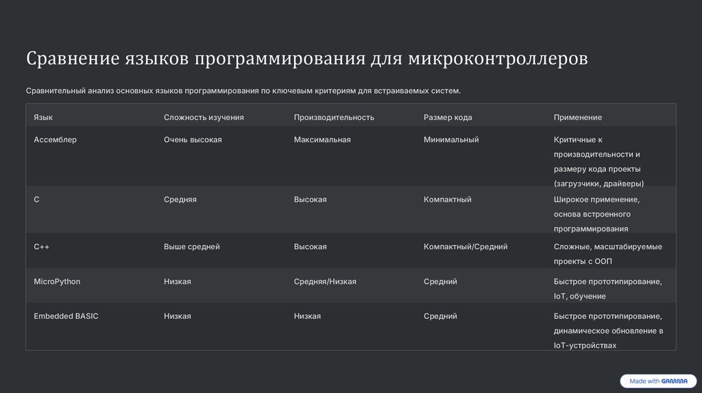 Сравнение языков программирования для микроконтроллеровСравнительный анализ основных языков программирования по ключевым критериям для встраиваемых систем.