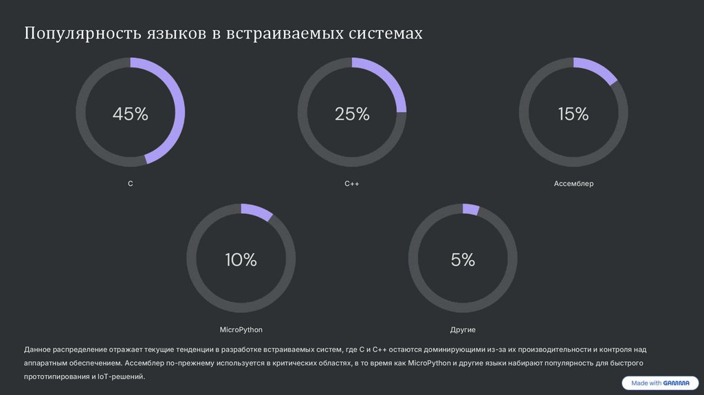 Данное распределение отражает текущие тенденции в разработке встраиваемых систем, где C и C++ остаются доминирующими из-за их производительности и контроля над