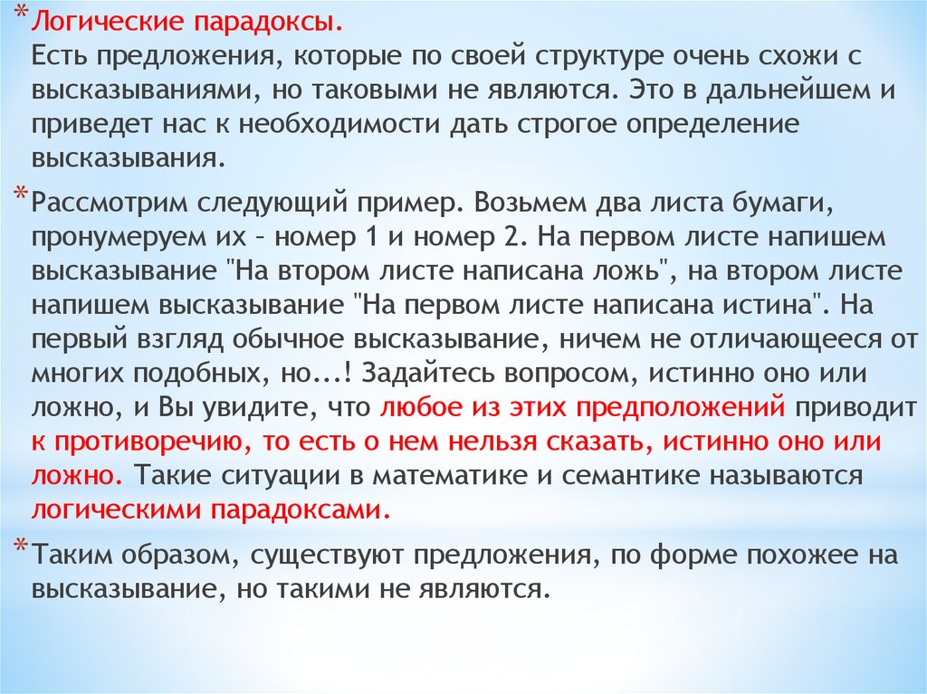 * Логические парадоксы.Есть предложения, которые по своей структуре очень схожи с