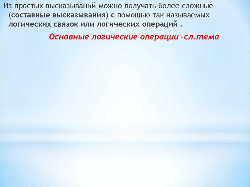 Из простых высказываний можно получать более сложные(составные высказывания) с помощью так называемых
