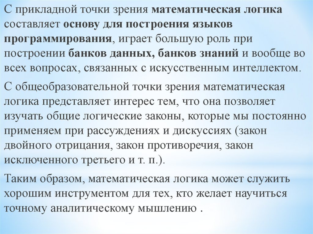 С прикладной точки зрения математическая логикасоставляет основу для построения языков