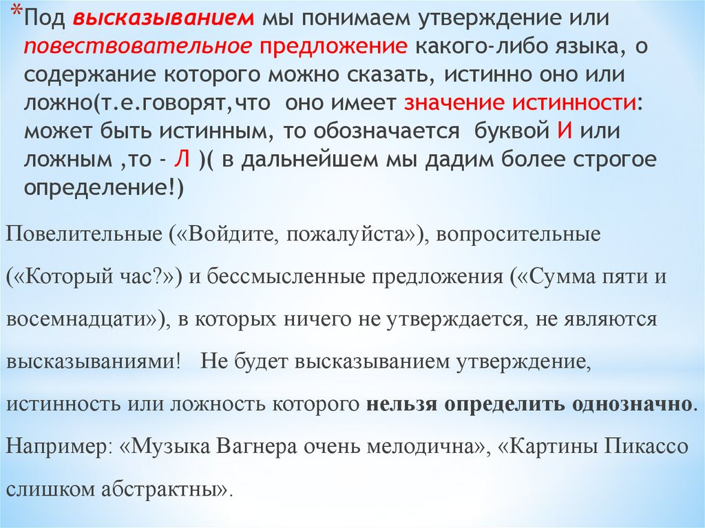 *Под высказыванием мы понимаем утверждение илиповествовательное предложение какого-либо языка, о