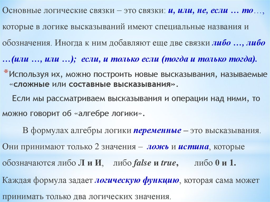 Основные логические связки это связки: и, или, не, если … то…,которые в логике высказываний имеют специальные названия и