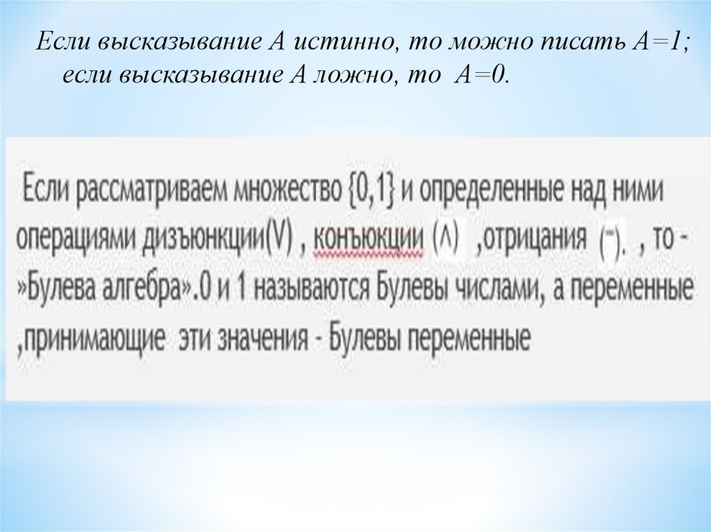 Если высказывание А истинно, то можно писать А=1;если высказывание А ложно, то А=0.