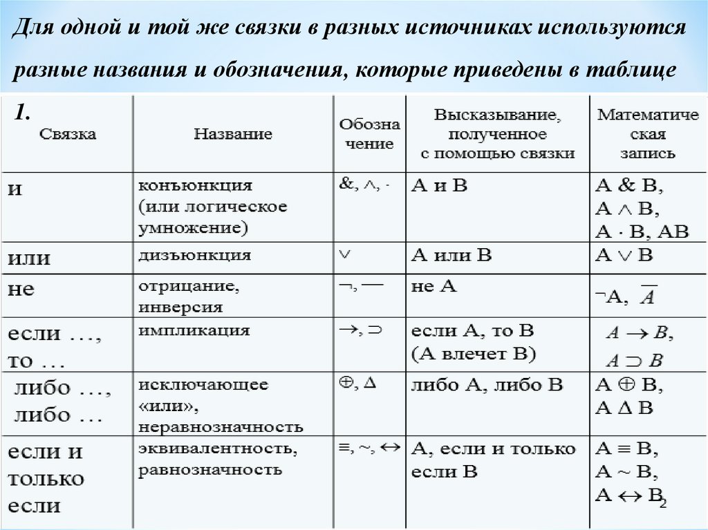 Для одной и той же связки в разных источниках используютсяразные названия и обозначения, которые приведены в таблице