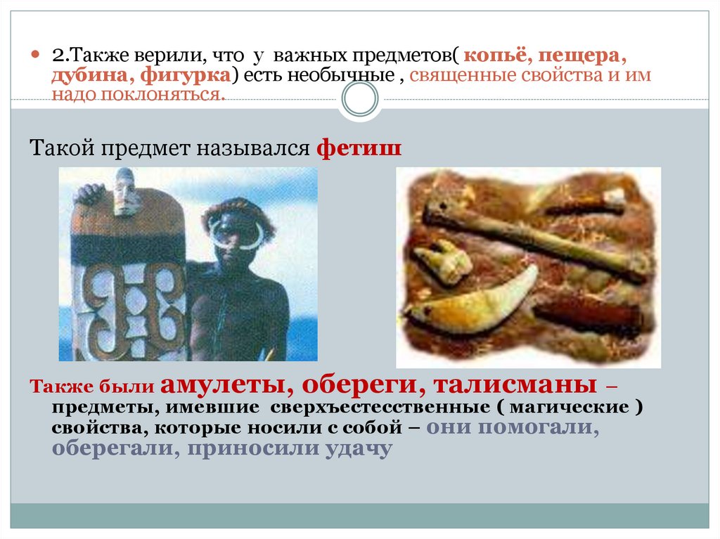2.Также верили, что у важных предметов( копьё, пещера,дубина, фигурка) есть необычные , священные свойства и им