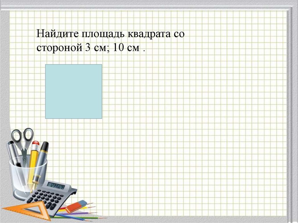 Найдите площадь квадрата состороной 3 см; 10 см .