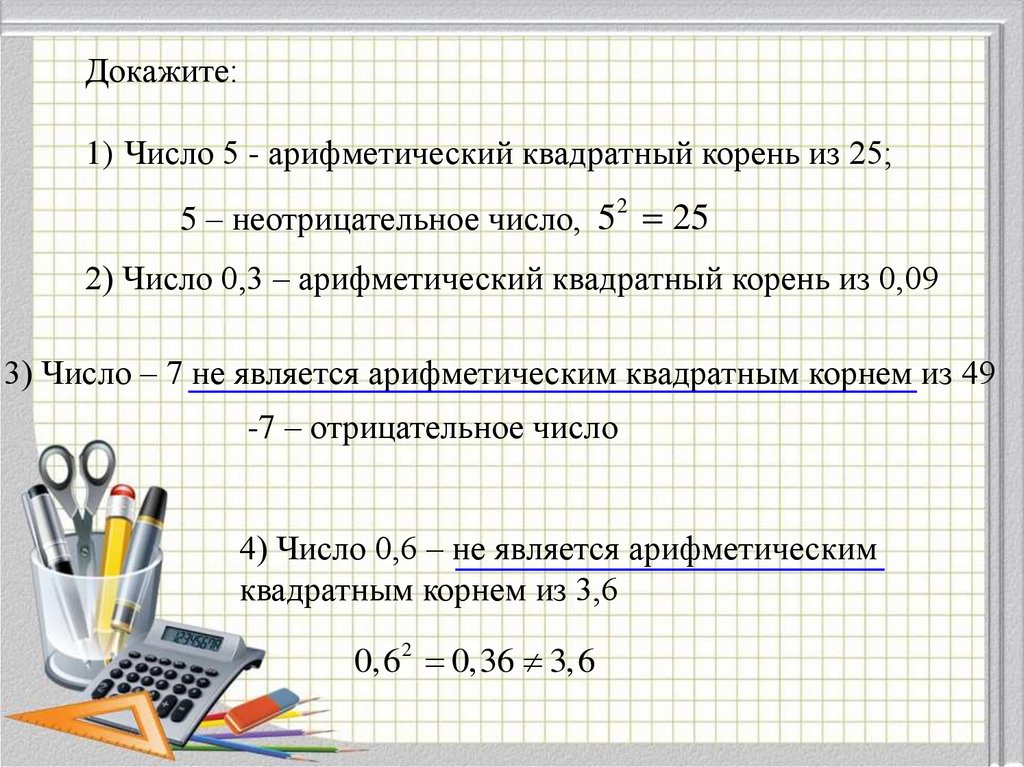 Докажите:1) Число 5 - арифметический квадратный корень из 25;