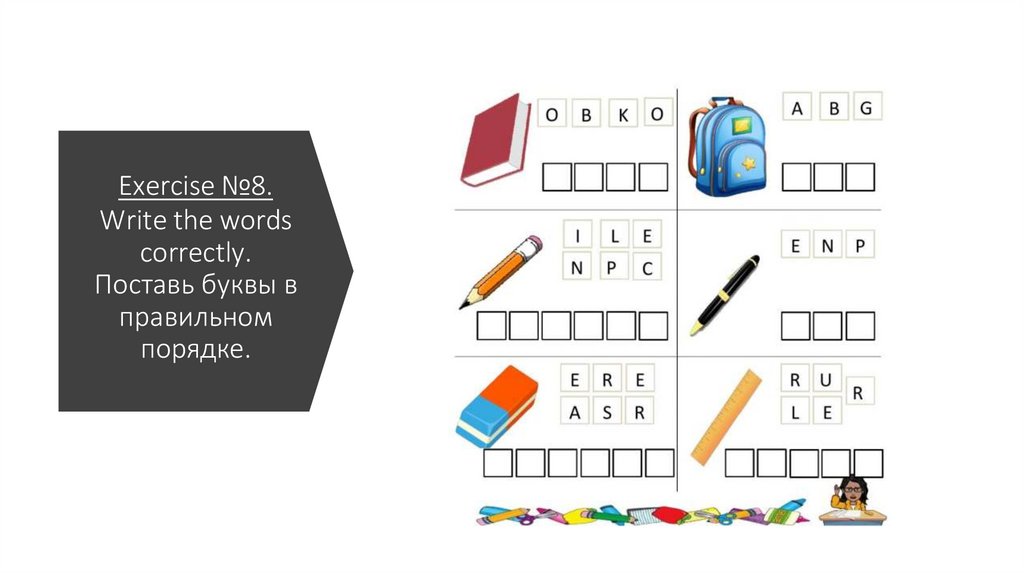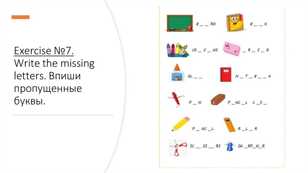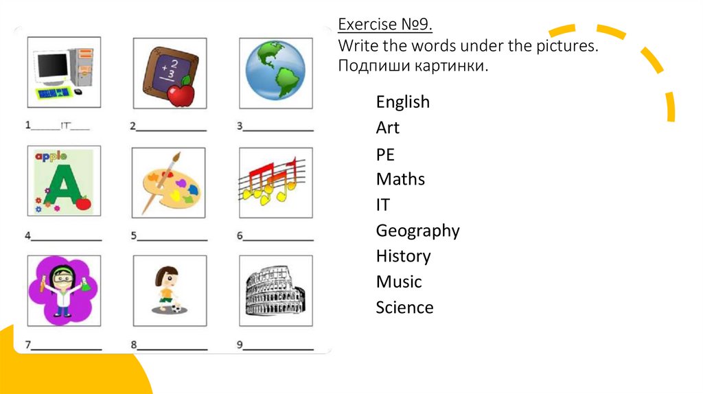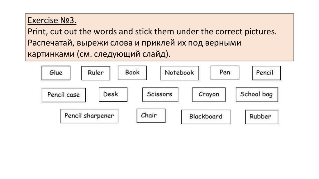 Exercise №3.Print, cut out the words and stick them under the correct pictures.