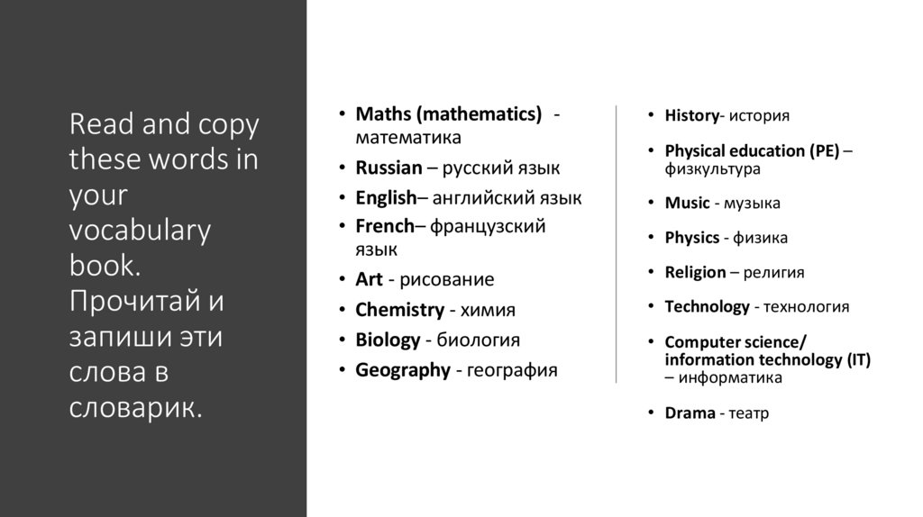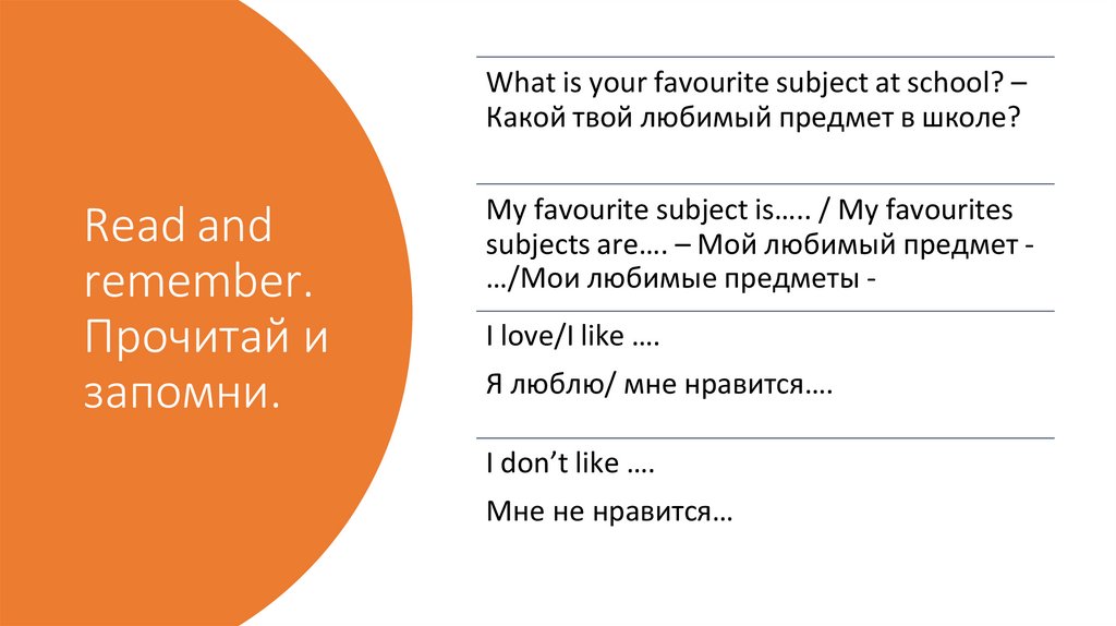 subjects are…. – Мой любимый предмет …/Мои любимые предметы I love/I like ….