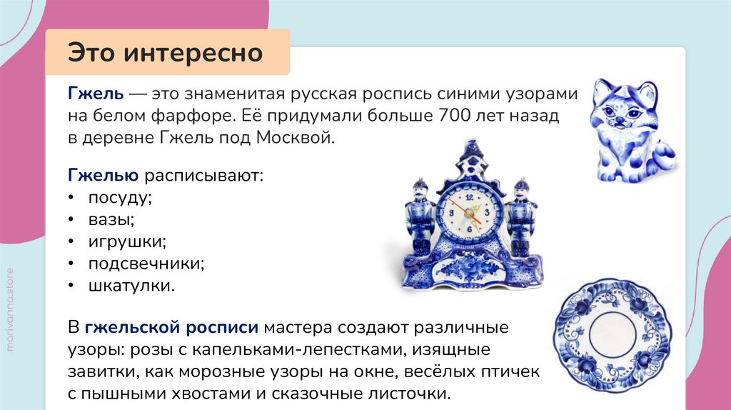 Это интересноГжель — это знаменитая русская роспись синими узорами