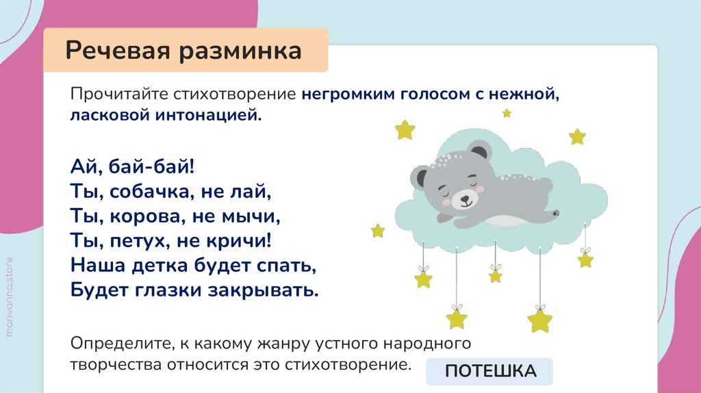 Речевая разминкаПрочитайте стихотворение негромким голосом с нежной,