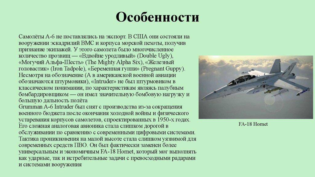 ОсобенностиСамолёты А-6 не поставлялись на экспорт. В США они состояли на