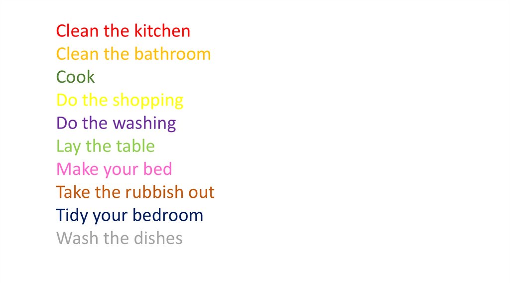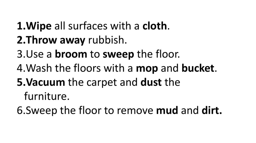 1.Wipe all surfaces with a cloth.2.Throw away rubbish.