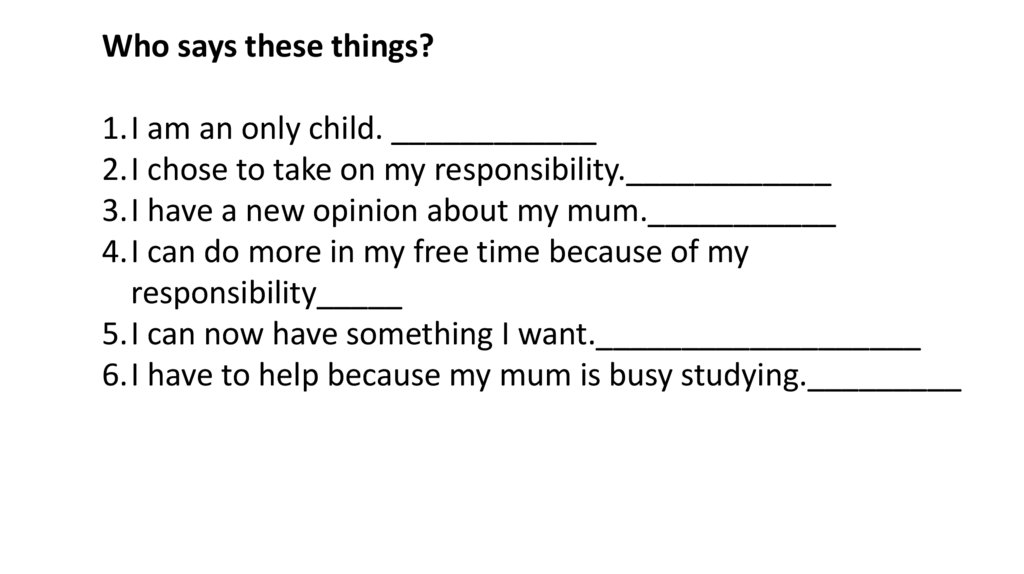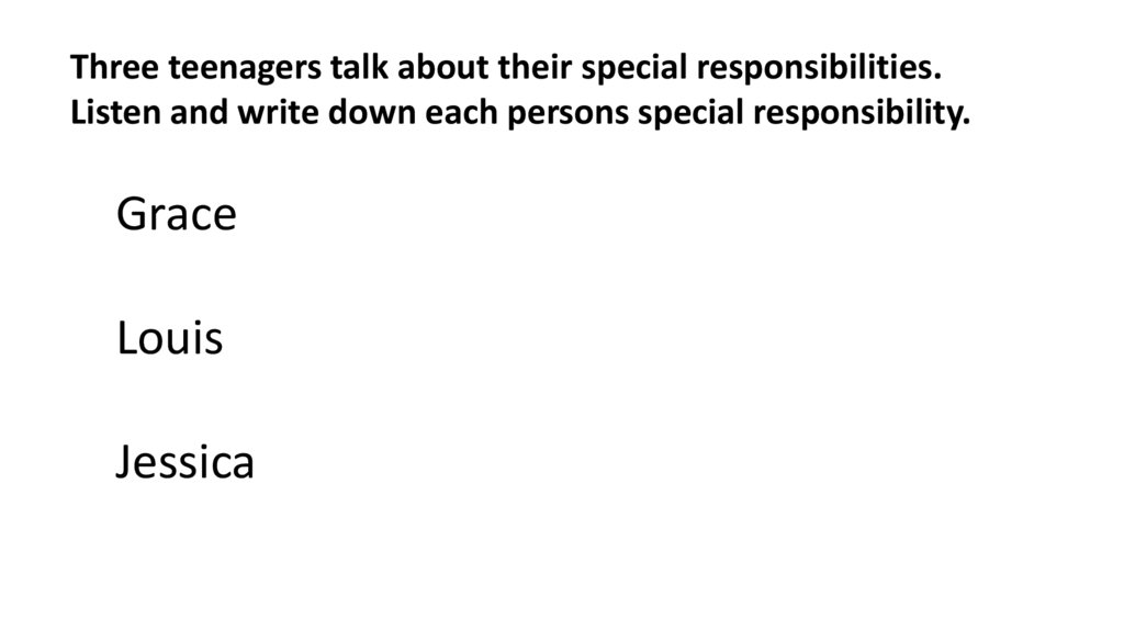 Three teenagers talk about their special responsibilities.Listen and write down each persons special responsibility.
