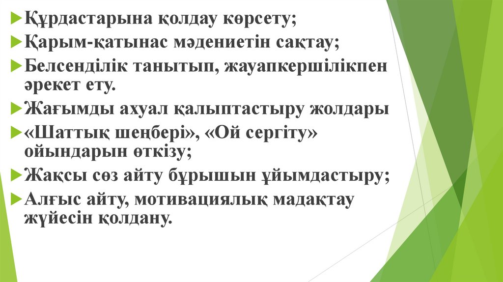 Құрдастарына қолдау көрсету;Қарым-қатынас мәдениетін сақтау;