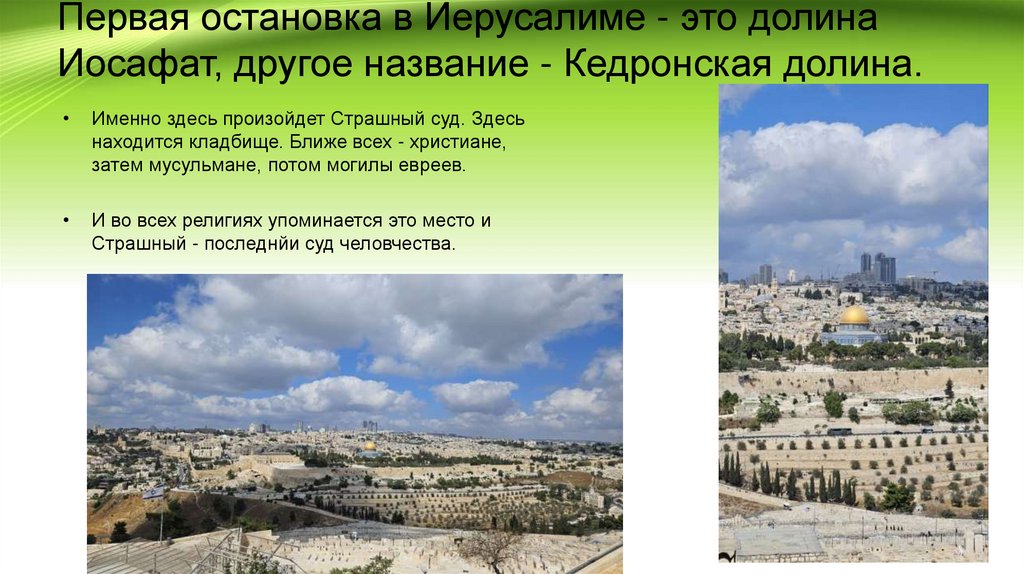 Первая остановка в Иерусалиме - это долинаИосафат, другое название - Кедронская долина.