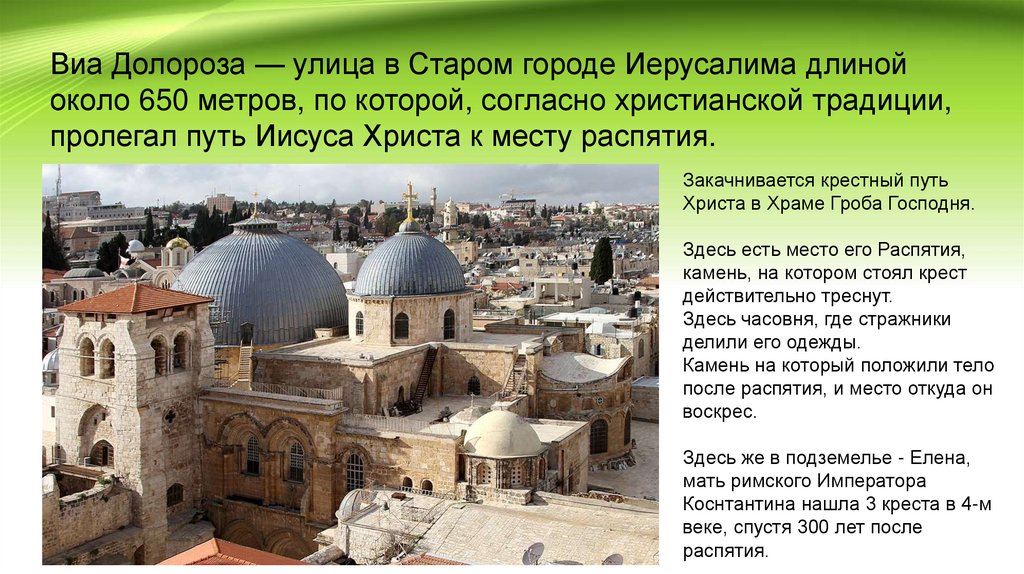 Виа Долороза — улица в Старом городе Иерусалима длинойоколо 650 метров, по которой, согласно христианской традиции,