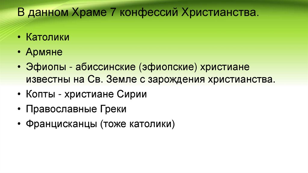 В данном Храме 7 конфессий Христианства.• Католики