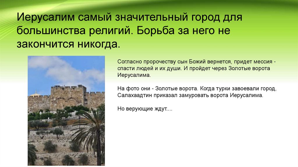 Иерусалим самый значительный город длябольшинства религий. Борьба за него не