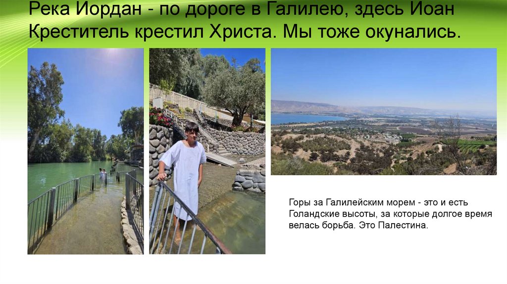 Река Иордан - по дороге в Галилею, здесь ИоанКреститель крестил Христа. Мы тоже окунались.