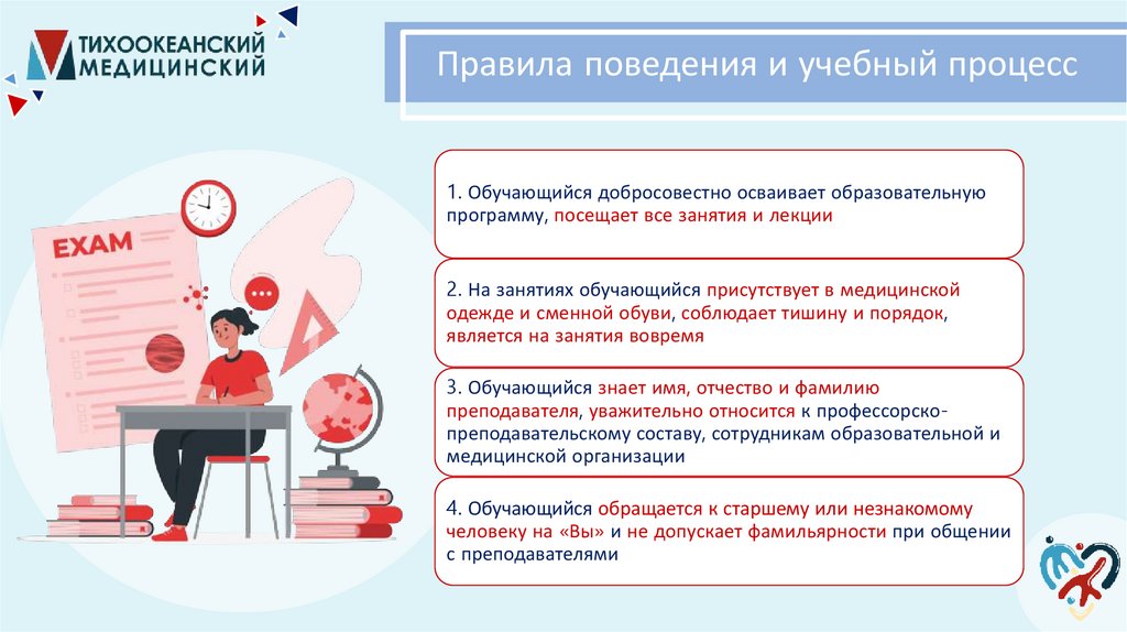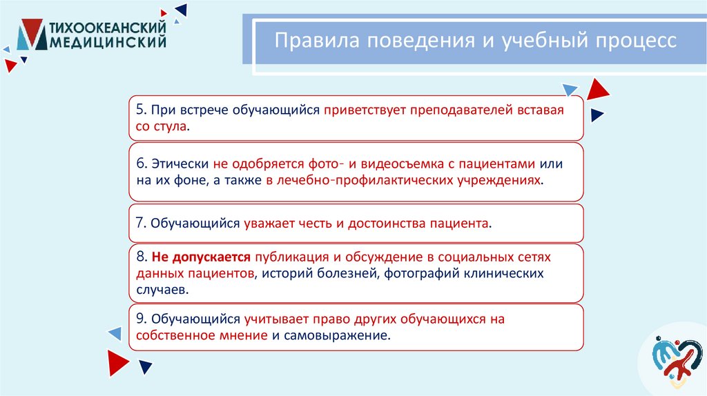 Правила поведения и учебный процесс5. При встрече обучающийся приветствует преподавателей вставая