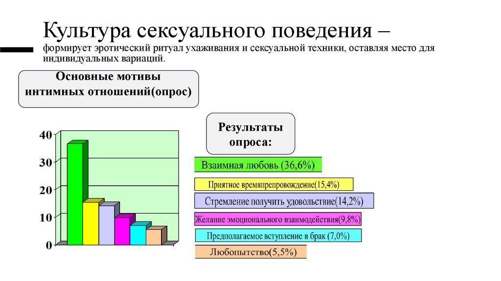 Культура сексуального поведения –формирует эротический ритуал ухаживания и сексуальной техники, оставляя место для