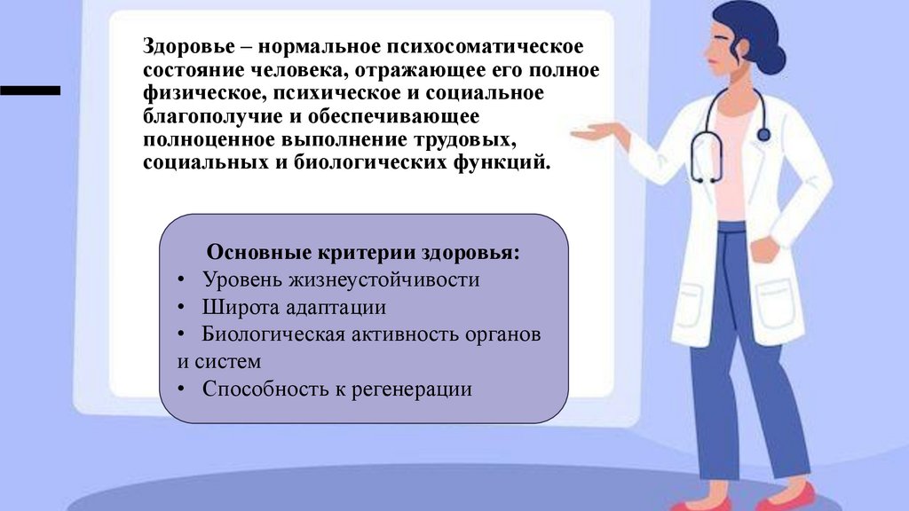 Здоровье – нормальное психосоматическоесостояние человека, отражающее его полное