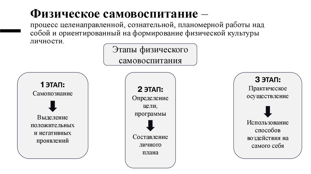 Физическое самовоспитание –процесс целенаправленной, сознательной, планомерной работы над