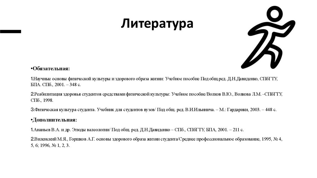 1.Научные основы физической культуры и здорового образа жизни: Учебное пособие Под общ.ред. Д.Н.Давиденко, СПбГТУ,