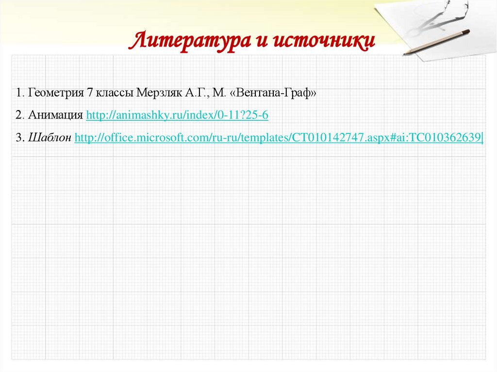 Литература и источники1. Геометрия 7 классы Мерзляк А.Г., М. «Вентана-Граф»