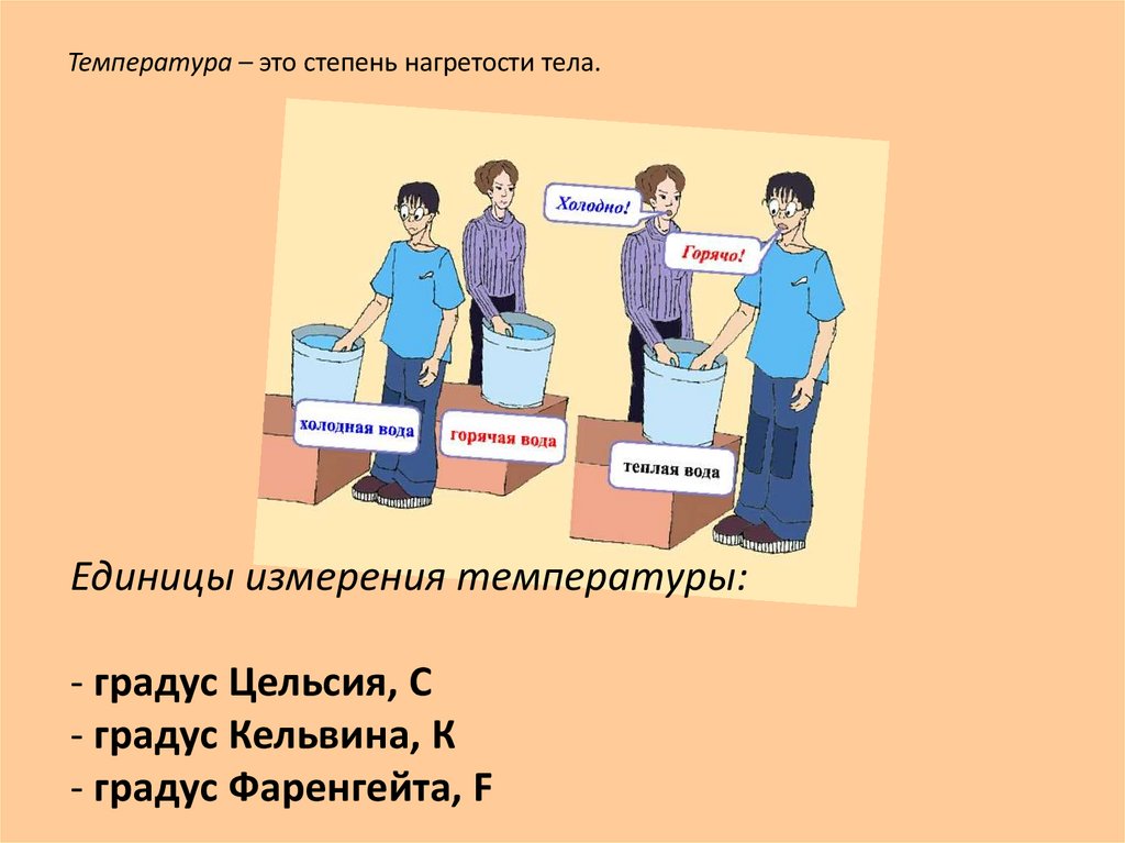 Температура – это степень нагретости тела.Единицы измерения температуры:
