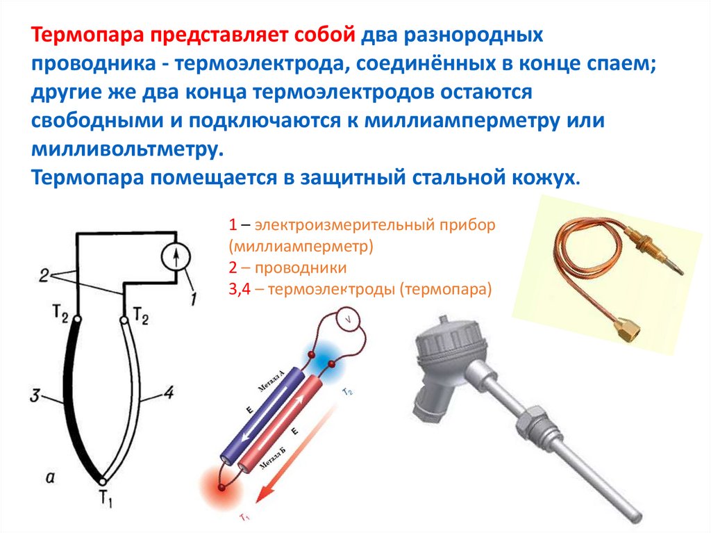 Термопара представляет собой два разнородныхпроводника - термоэлектрода, соединённых в конце спаем;