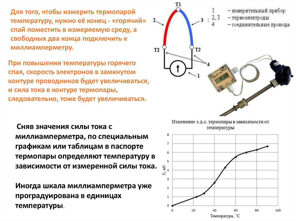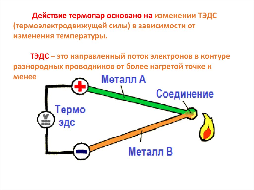 Действие термопар основано на изменении ТЭДС(термоэлектродвижущей силы) в зависимости от