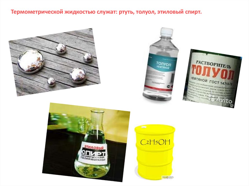 Термометрической жидкостью служат: ртуть, толуол, этиловый спирт.9.