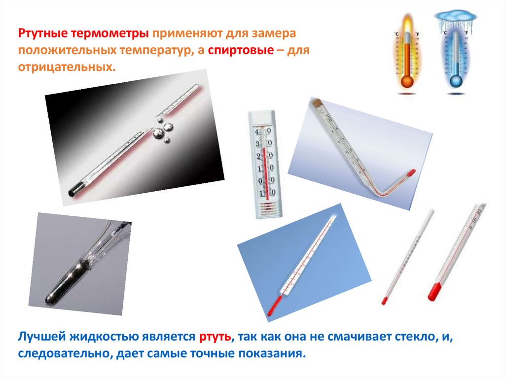 Ртутные термометры применяют для замераположительных температур, а спиртовые – для
