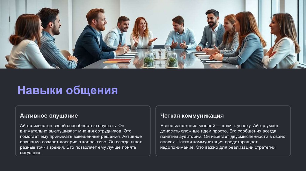 решения. Часто использовался принцип общей выгоды компании. Он умел находить компромиссы. Айгер подчеркивал