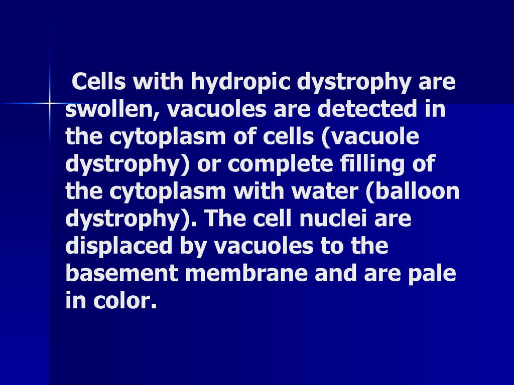 Cells with hydropic dystrophy areswollen, vacuoles are detected in