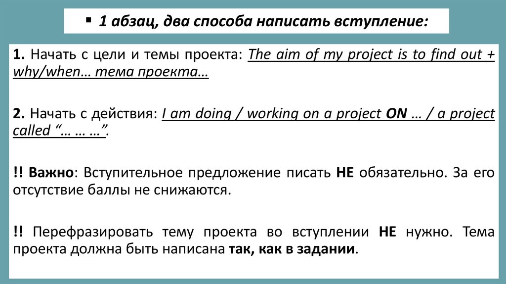 1 абзац, два способа написать вступление:1. Начать с цели и темы проекта: The aim of my project is to find out +