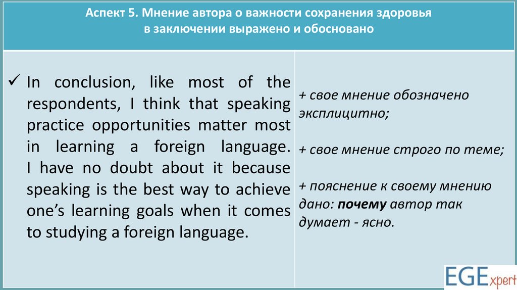 Аспект 5. Мнение автора о важности сохранения здоровьяв заключении выражено и обосновано