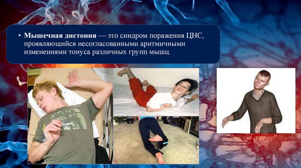 • Мышечная дистония — это синдром поражения ЦНС,проявляющийся несогласованными аритмичными