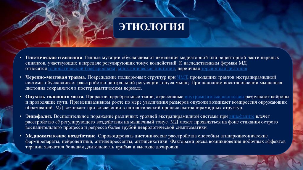 ЭТИОЛОГИЯ• Генетические изменения. Генные мутации обуславливают изменения медиаторной или рецепторной части нервных