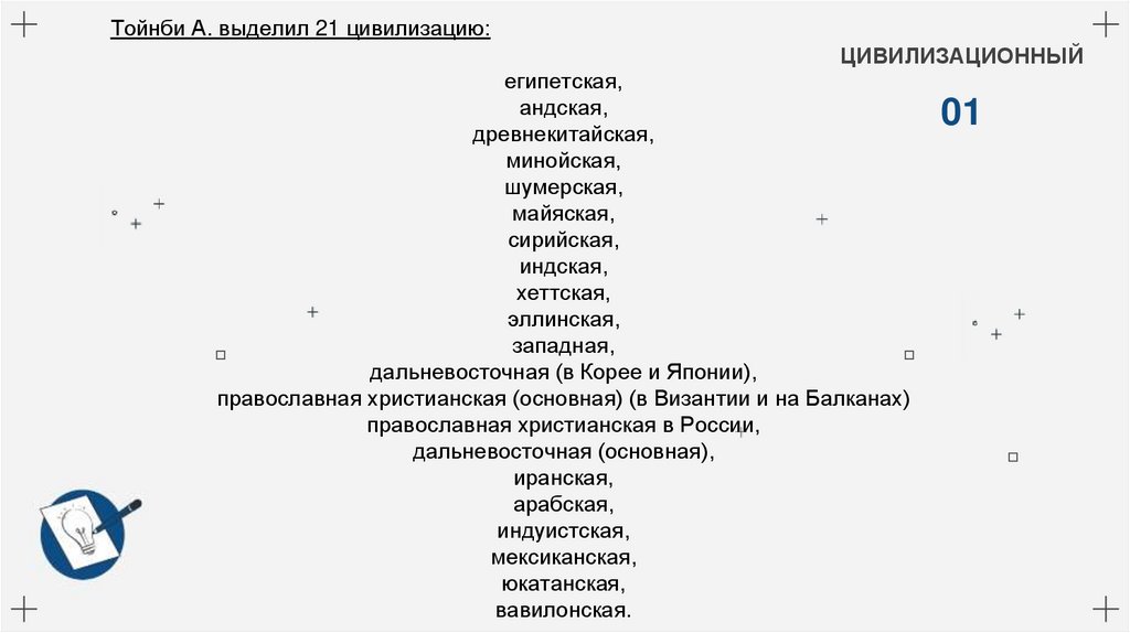 Тойнби А. выделил 21 цивилизацию:ЦИВИЛИЗАЦИОННЫЙ