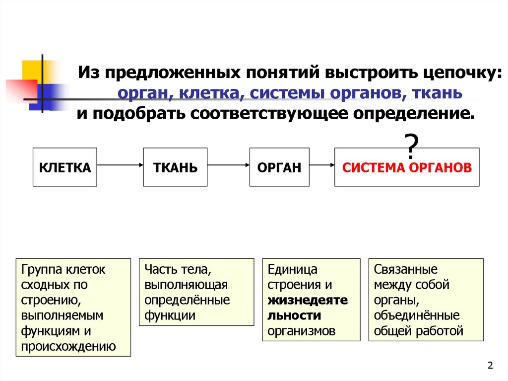 Из предложенных понятий выстроить цепочку:орган, клетка, системы органов, ткань