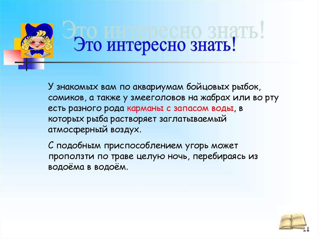 У знакомых вам по аквариумам бойцовых рыбок,сомиков, а также у змееголовов на жабрах или во рту